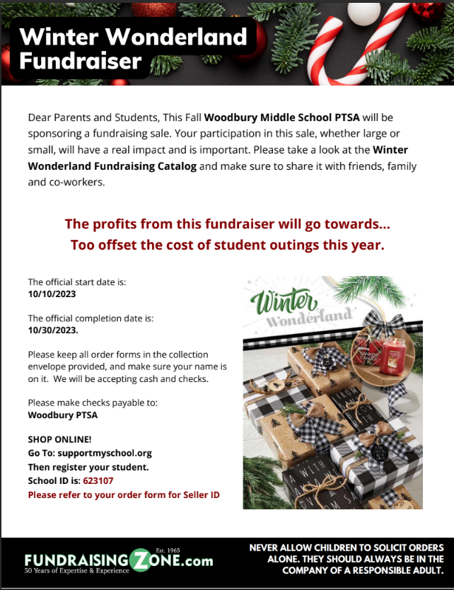 Last week, your student received a green and white packet that contained the fall Woodbury PTSA fundraiser. Please consider participating, as the money raised will help this organization support Woodbury students. The top three sellers will receive an Amazon gift certificate. Please have your child stop by the main office if you need another packet. This fundraiser will end on October 30th.